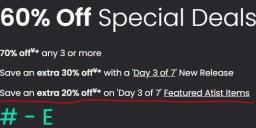 Trying to find out b/c it looks like it is saying the items are 60% and 70% with 3 or more and then another 30% with a day 3 of 7 new release plus 20% off the d3of7 Featured Artist items.