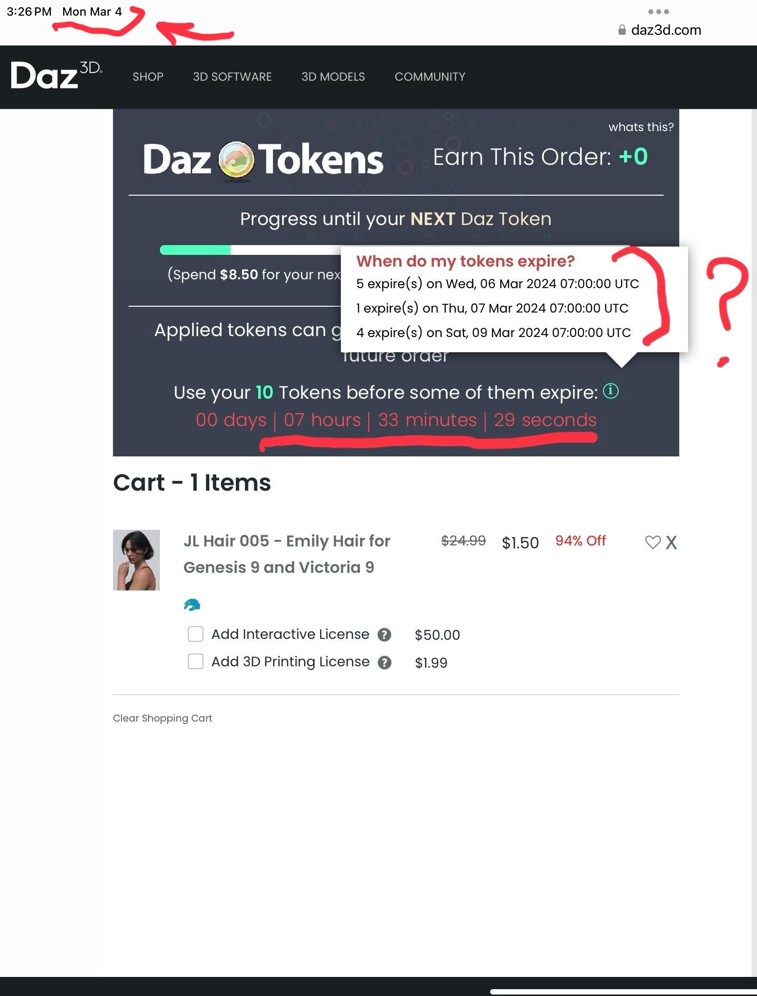 That's what I thought but on the bottom it said they would expire last night Monday at Daz midnight (in 7 hours from when I checked) but when I looked under info, they expire tonight. Today it says they expire in 0 days, 0 minutes and 0 seconds which doesn't even make sense but under info, it shows the correct days and times. If you don't click on info, it's very misleading.