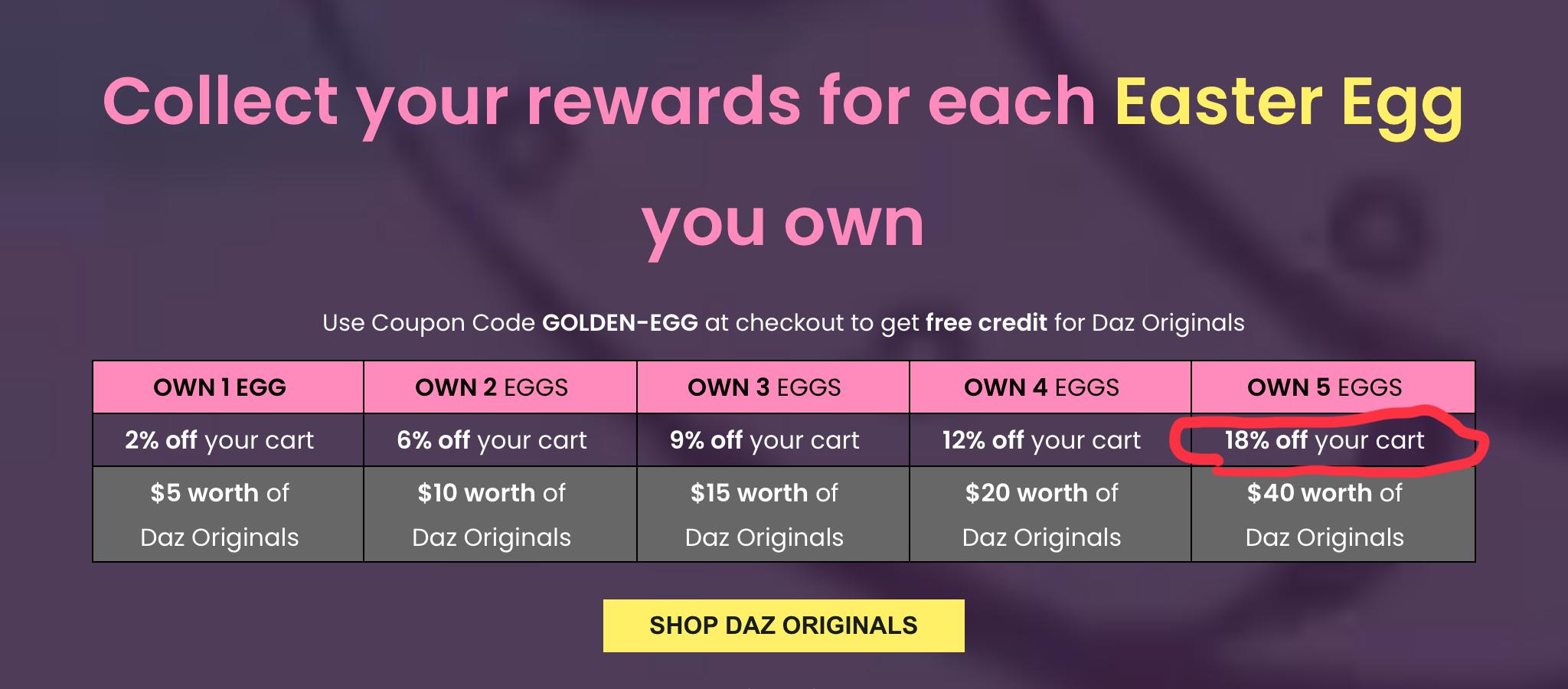 I have 5 eggs, and it seems to be discounting the DAZ Originals correctly (for me).