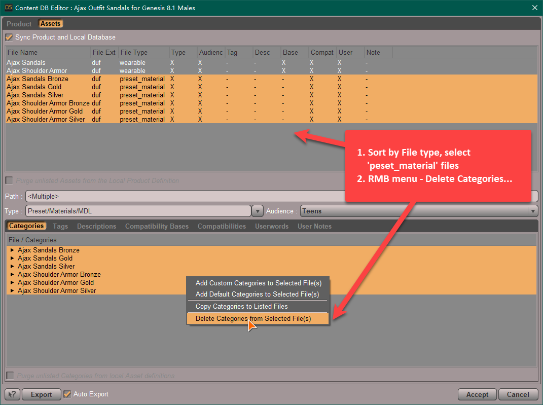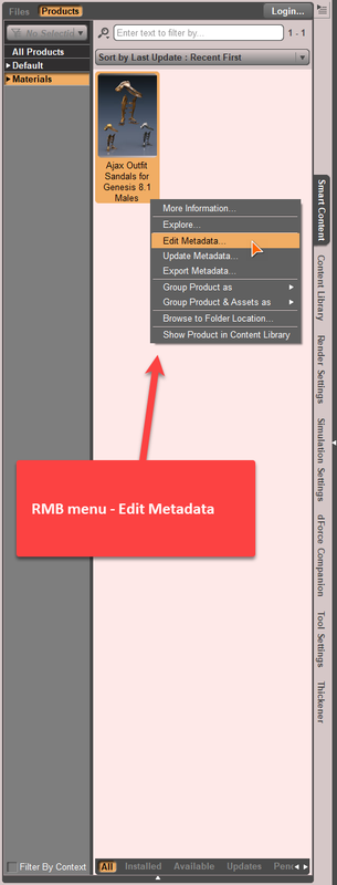 Although I was not successful in editing "DAZ_3D_87027_Ajax_Outfit_Sandals_for_Genesis_8_1_Males.dsx" and executing "Re-Import Metadata," I found success in using "Edit Metadata" in the "Smart Content" tab.