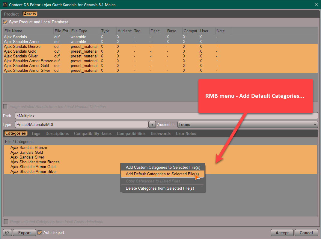 I have attempted to locate the metadata or support folder for the product, but I have been unable to find them. I have also searched within the metadata file "Sandals_27868.dsf," but I could not find any relevant lines for category classification.