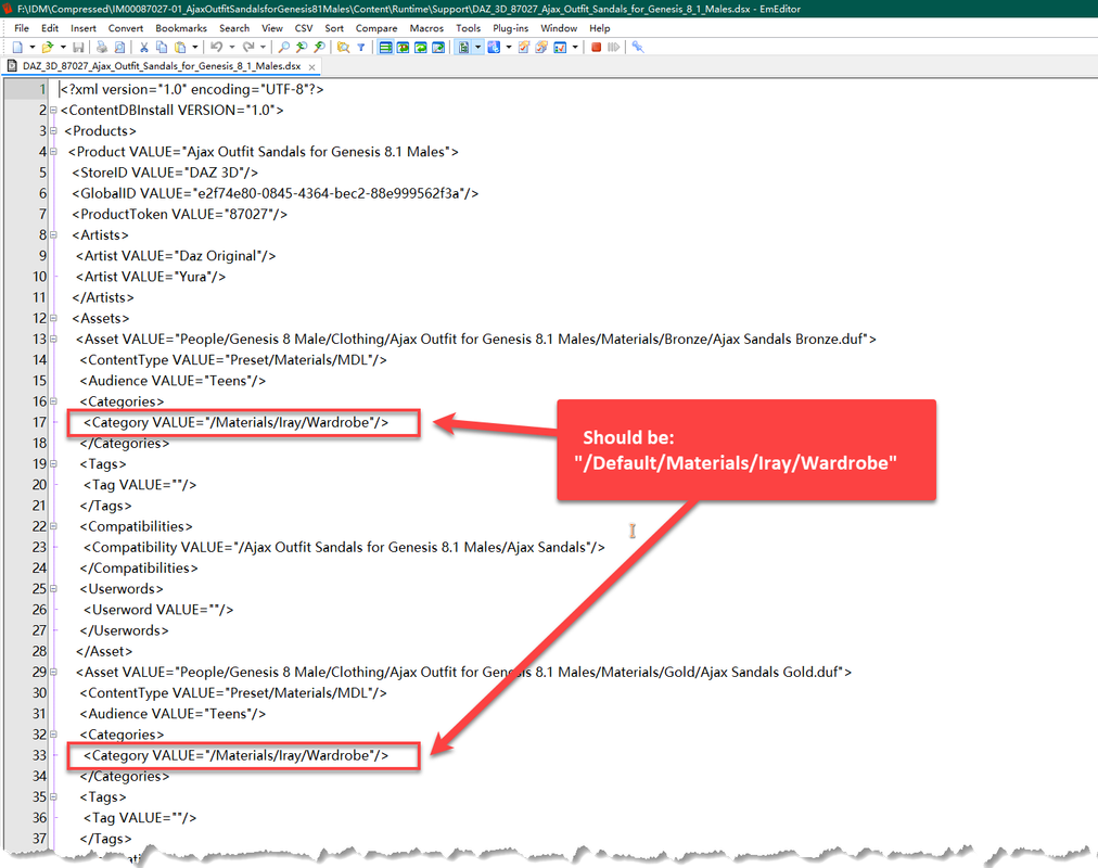 1) Go to the directory: Your Daz Library\Runtime\Support, search dsx file: 'DAZ_3D_87027_Ajax_Outfit_Sandals_for_Genesis_8_1_Males.dsx'. Open it with a Text Editor (EmEditor, Notepad++, etc), replace "/Materials/Iray/Wardrobe" with "/Default/Materials/Iray/Wardrobe", and save...