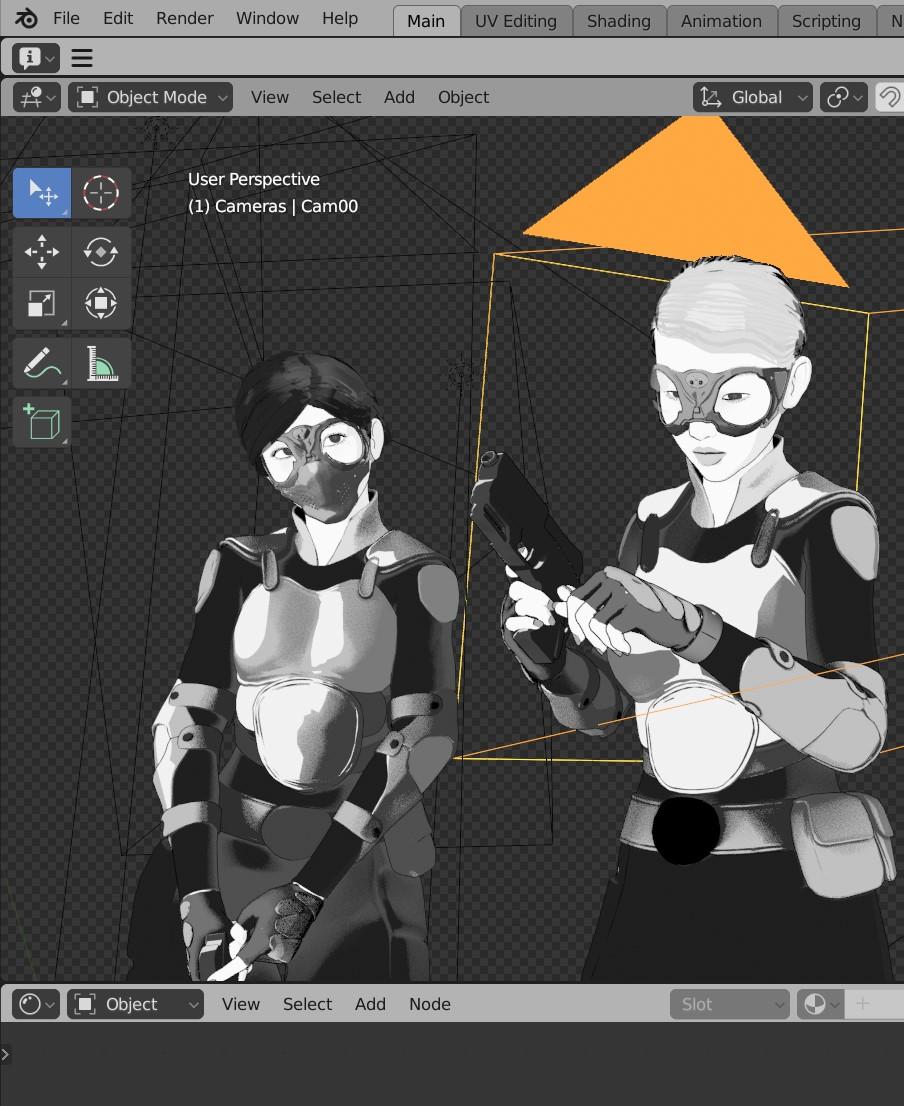 Those where the result of simple PNG alphas. I layered them over the key light and shadows in the shader. Nothing complicated. It seems unwrapping the UV in Blender for the Sci-Fi Police Outfit GF8 is fairly straightforward. Other Daz assets I have in mind require more complex techniques. Apart from that, it's just good choice of colors and lighting -- complementary choices that enhance the vibrance of the scene.