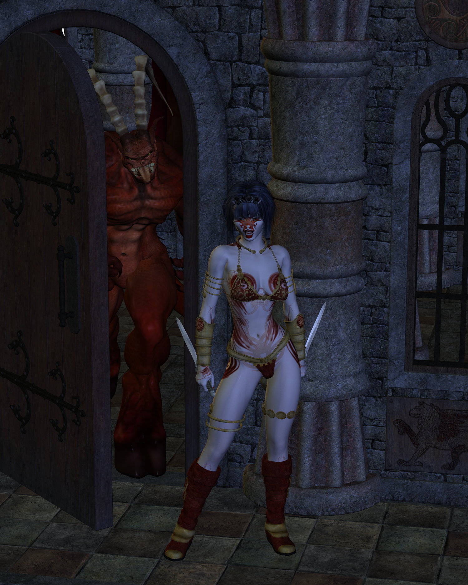 Hey, Saph. I really like the "Angel The Goddess Warrior" render. Pump up the lighting by increasing that lovely yellow rim light. Also, you can shine a yellow spotlight on the background behind the demon, and add another shining on the demon from the left side. This will give a source for the rim light.