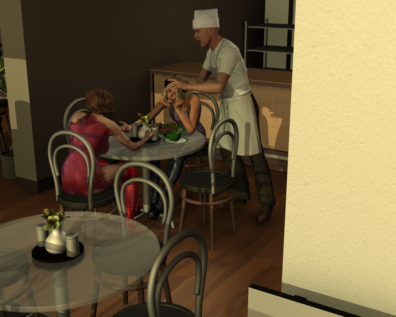 The lighting is not bad - there's lots of nice shadows and rim lights. Perhaps add a pointlight next to the faces to highlight them. You want these to be subtle. Adjust the pose on the waiter - his feet aren't touching the ground. Also, the angle of his hand looks like it's on the woman's head. There isn't much else as this is a good render. Great poses.