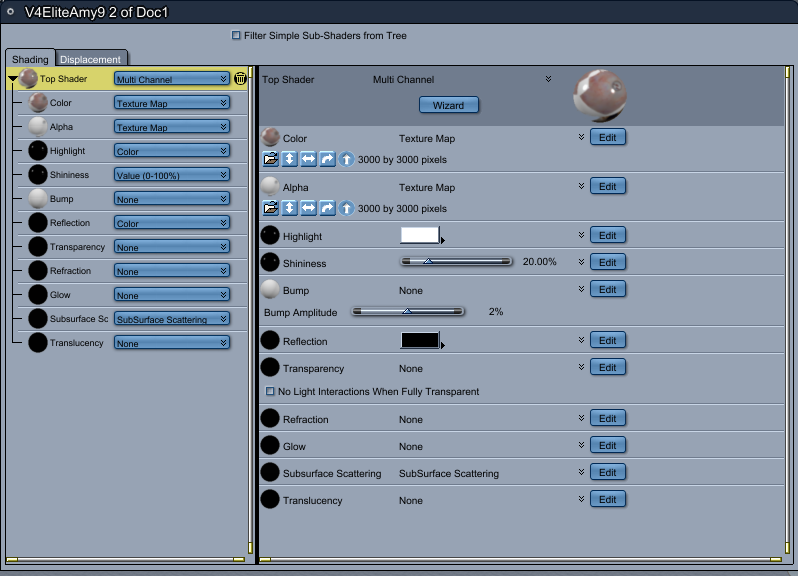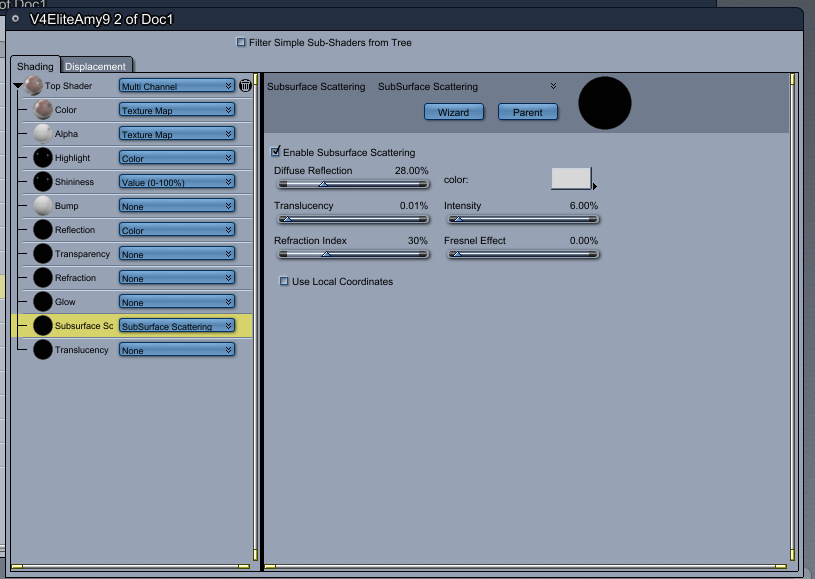 You might notice I don't have reflections enabled. Sometimes I do use reflection, but I find that just the highlight is usually sufficient for most of my needs. Reflections will slightly slow your render time (not a biggie) but also stop some of the light from getting through to your iris, which has the net effect of darkening the iris. But in certain circumstances, I also enable reflection (in the cornea).
