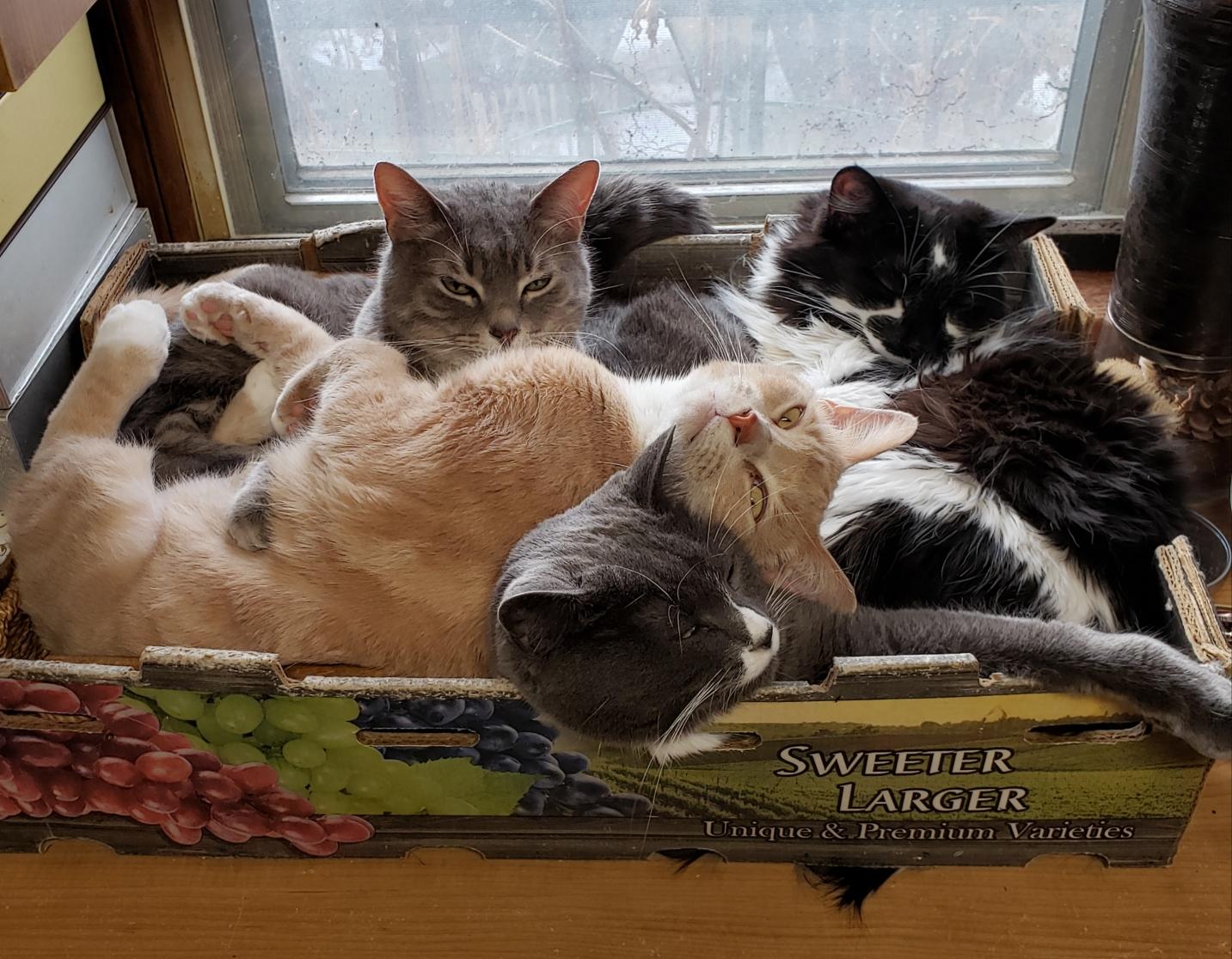 Awww... A kitty casserole. It's hard to tell where one cat ends and another begins... kinda contradicts that old saying "They're going at it like two cats in a bag"... because apparently if you put four(?) in a shallow tray-box, they merge into one zen feline entity who can radiate transcendental purr rays out into the cosmos creating peace, love and sleepiness.