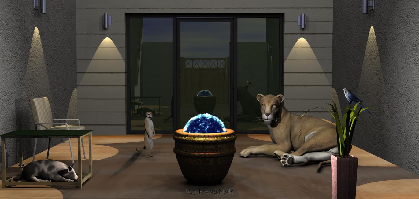 I also made an indoor render, adding a number of animals (lion, meerkat, piggy) from DAZ and budgy is a freebie. I added a planet or sun from the space construction set (Horo and David B).