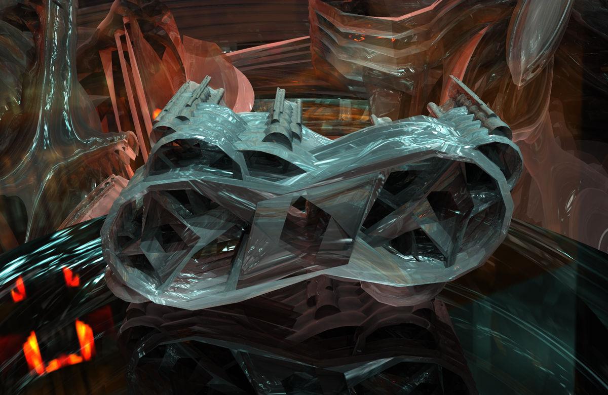 The object was generated by a formula (Neon) in Incendia_NEXT and given a self made material. It stands on the ground plane and is with the camera within a sphere without shadow casting, some transparency and reflection. Light and colour by the IceFire3-HD HDRI (unpublished) outside of the sphere. An uncommon object as base for an abstract creation.