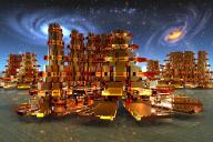 The object was generated in Incendia_NEXT, three times instanced, and given a material from Fifty Funky Shapes and Fifty Funky Metals. They stand on the ground plane with a material partly from Stylised Rendering. Stars and galaxies are from the Space Construction Kit, light and background by an HDRI from Deep Space HDRI 2. A far away world with golden towers as housing blocks.