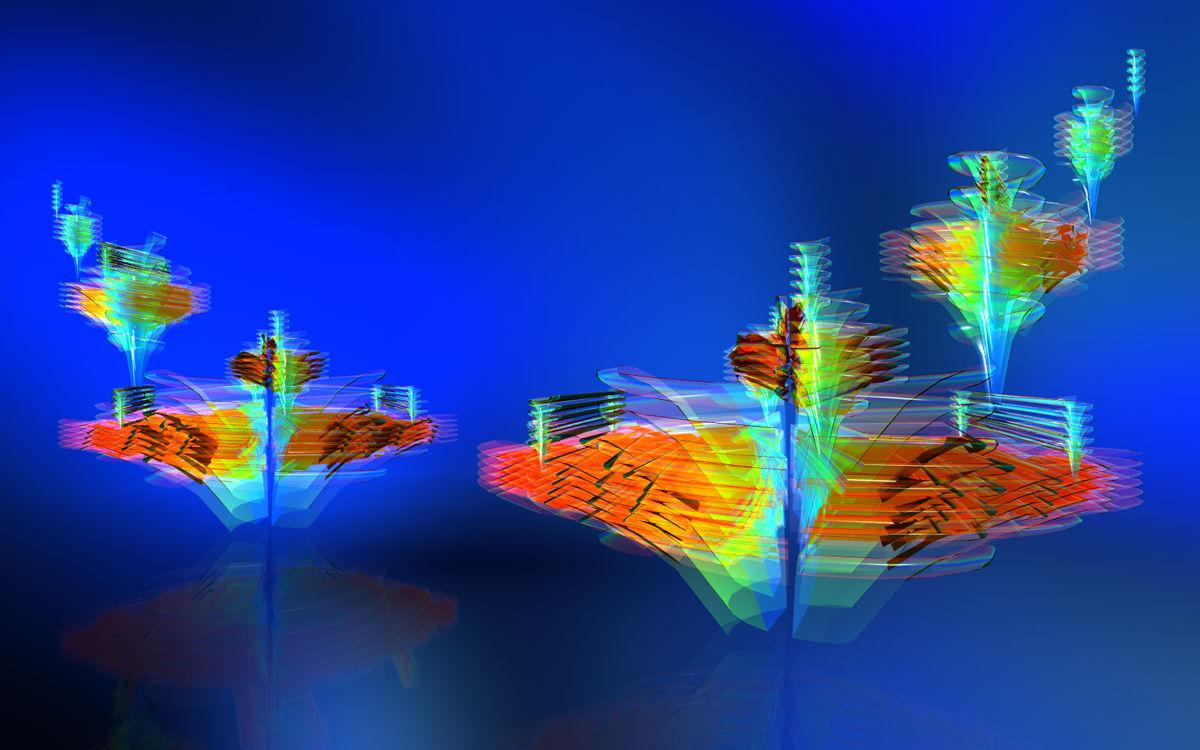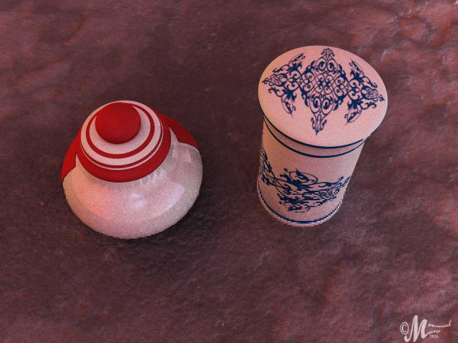 The object was made in IncendiaNEXT, exported to Geometrica, cleaned-up in MeshLab and smoothed in Bryce, then copied and one turned around. The material was self made and the objects rest on a Fading Disk. Background and light by an HDRI from Hypertextures Base and a bit of specularity by the sun but no light.