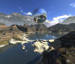 Double stacked self made terrain with materials from the High Resolution Terrains 2 & 3 sets. The water is a 2D-Face with my own material. Sky and ambient light by an HDRI from Environments - Inclement Weather and the key light by the sun.
