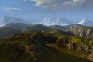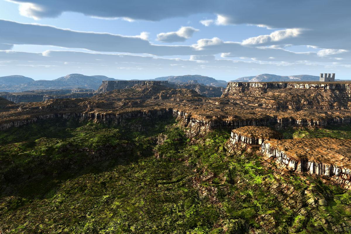 In front a double stacked terrain from HRT-1 and another three in the back from HRT-2 with materials from HRT-2, sky by a CloudSphere, the ambient light by the inherent HDRI from the Sky Toolbox, the castle was self made years ago.