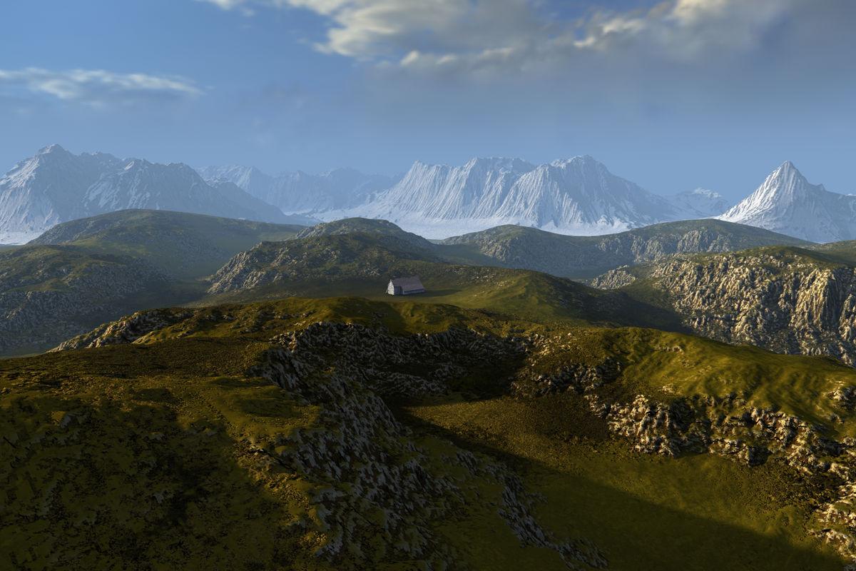 Two terrains from Terrain Stacking (from at bryce-tutorials) with materials near from Gritstone Hills and far Grand Mountains. Sky and ambient light by an HDRI from Sunless HDRI Skies, the key light by the sun. The barn is by Marco Schneider aka c-ram (free on my website under Raytracing Resources Objects).