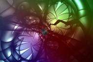 The object Spiky Knot was modelled by David Brinnen in Wings3D. It is transparent with a high refractive index and is in the world centre, around it a longish sphere with a bit of transparency. Light and colours from the "Rainbow3_LLx2" HDRI shine from within the object and cast shadows on the surrounding sphere, behind of which the same HDRI colours the shadows a bit.