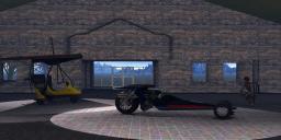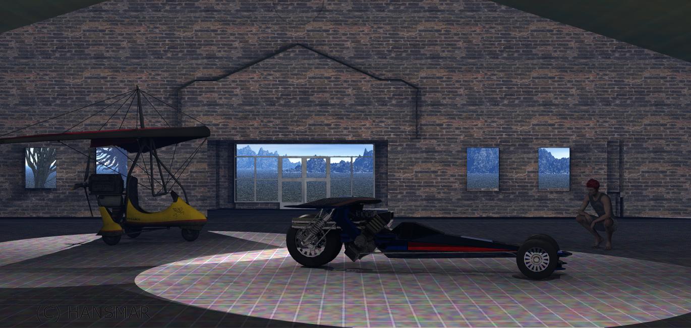 I used some elements, a building from Poser 9 content, a surfer dude from DAZ and two vehicles (drag trike and ultralight) also from DAZ with some trees and grass (partly 2D faces) in the background. There are some additional lights inside, as you can see.