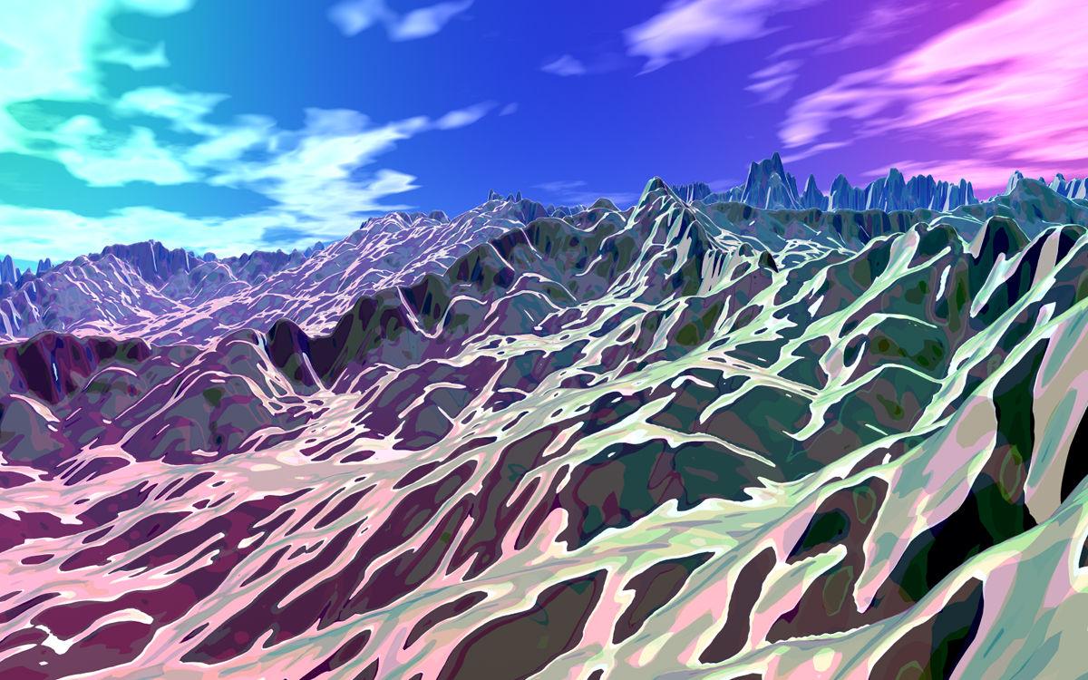 The terrain was self made and given a material according to the Specular Method (see https://horo.ch/docs/mine/pdf/DrawingEffects.pdf). Specular (light) and colour by the an HDRI, the sun with negative Specular enhances the contrast. A coloured drawing of a mountainscape.