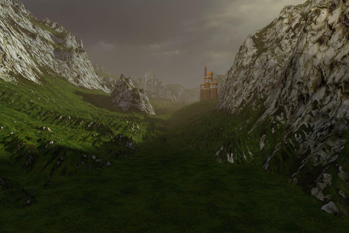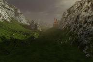 The terrain is from Gritstone Hills with a material from the same set and High Resolution Terrains 1. The castle is a part of the Grobburg (once availabe at Daz 3D) and the sky and ambient light by an HDRI from Sunless HDRI Skies and the key light by the sun. A narrow valley with a castle in hazy weather and low clouds.