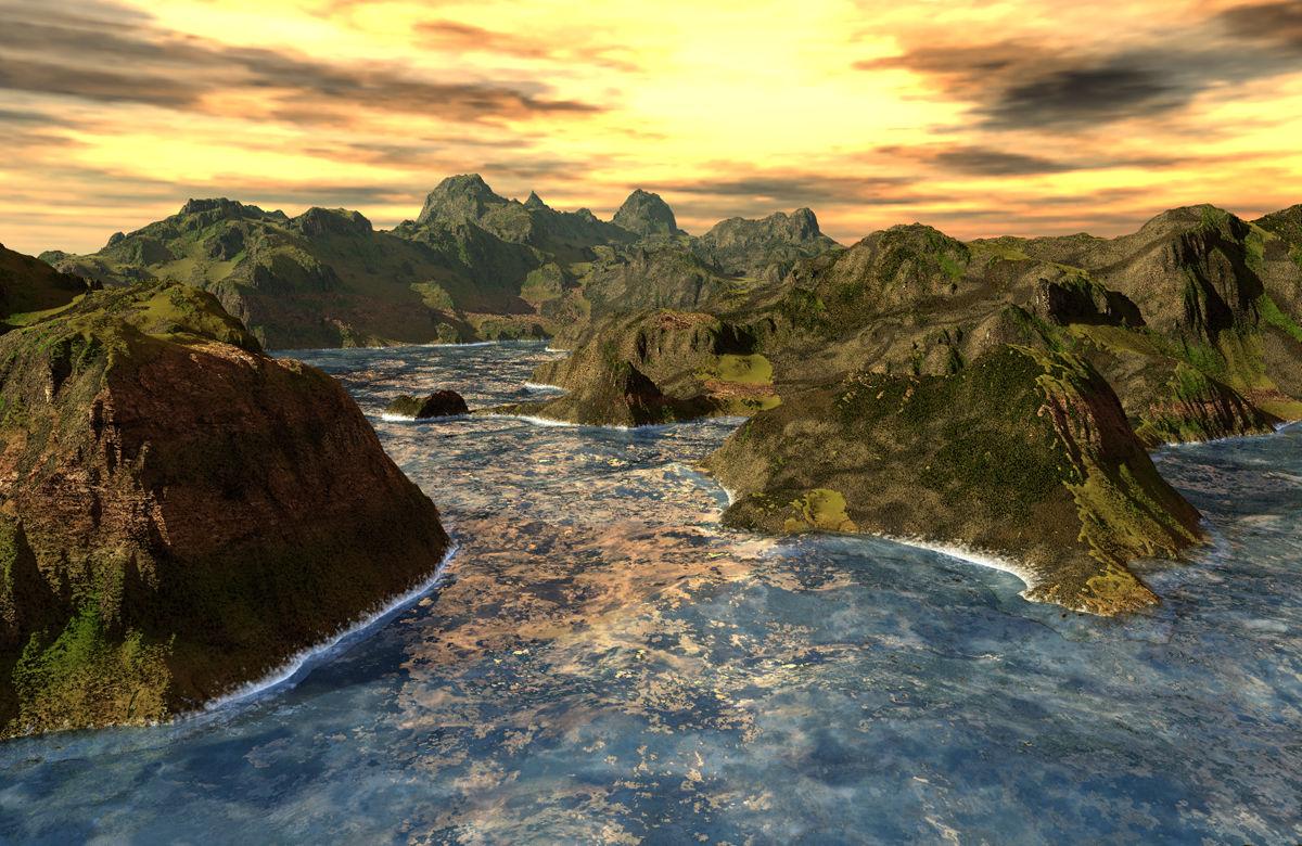 Double stacked Terrain from Grand Mountains with materials from High Resolution Terrains 1. The water is a self made terrain with a material from High Resolution Terrains 4. Sky and ambient light by an HDRI from HDRI Enhanced Skies and the key light by the sun.