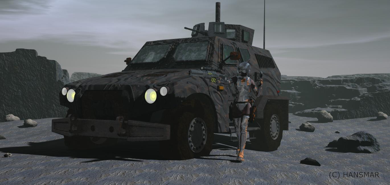 Hansmar: Nicely done and well retextured. I was a bit surprised, that you had to delete hidden parts of the vehicle and of the lady in order to save your picture. Maybe you explained it in a earlier post and I missed it. Anyway, I think usually you should not run into trouble with this constellation with one DAZ3D vehicle and one character. I have the "Army Hybrid Vehicle" as well and I tried to reconstruct your scene. I used the original textures of the vehicle and I hate to say it but I could save my scene without any problems. Task Manager says Bryce is using 1993 MB main storage. The scene itself takes up 314 MB of disk space. The vehicle object file is 47 MB in size. The G3 character 100 MB in size. I wish I could explain, why you run into trouble saving this scene, but I'm afraid I cannot.