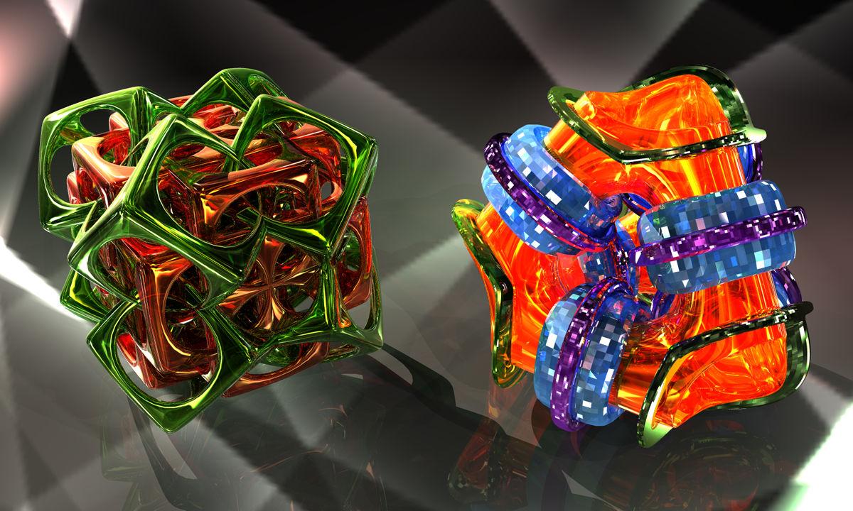 The objects were made in Wings3D and given my own materials. They stand on a Fading Disk. Background and ambient light by an HDRI from "HDRI for Fun", additional light and specular by the sun. Render time 10 hours.