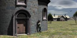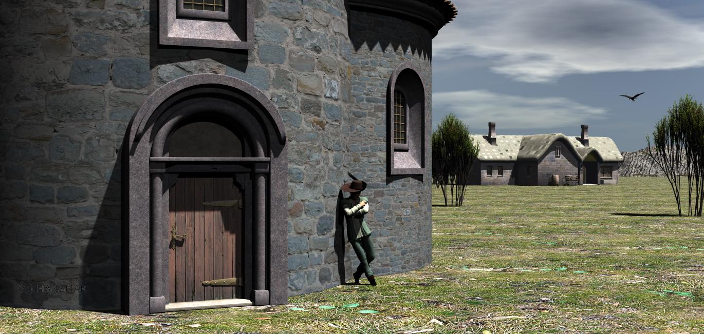 The chape and country house are from Alfons Blom. The ground texture is from David B and Horo and the trees are eco trees by from the Bryce pro 7.1 vegetation set by the same gentlemen. The man is Genesis with the adventurer for Genesis clothing. The sky is from Horo. The bird is a static freebie prop.
