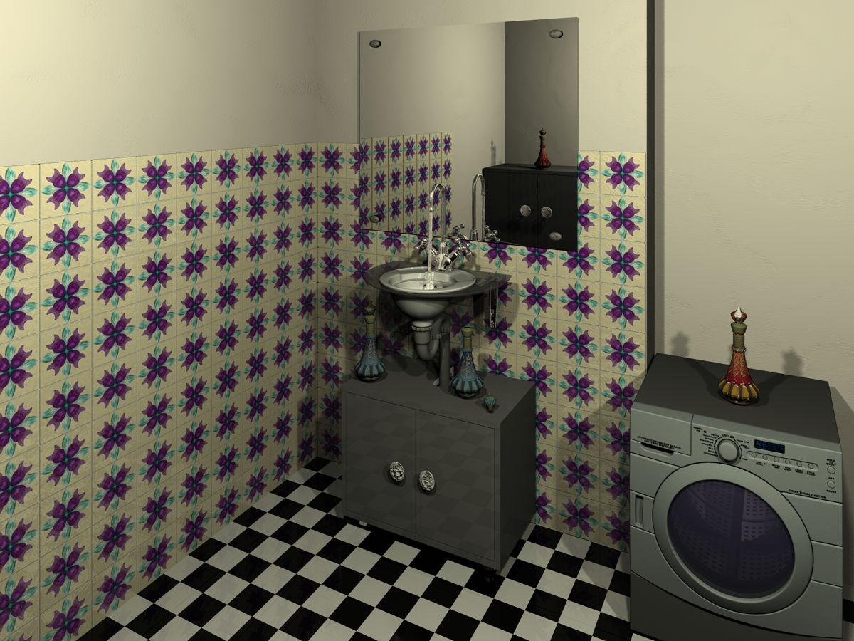 I redid a scene that was my third picture in the Daz Bryce September 2007 galleries. The sink with the faucets was modelled in Wings3D by David Brinnen, the room, furniture and tiles were self made, the Geniebottles and the washing machine were available at Daz 3D a long time ago. Light by three radials with soft shadows. The out-flowing water is a symmetrical lattice with a water material.