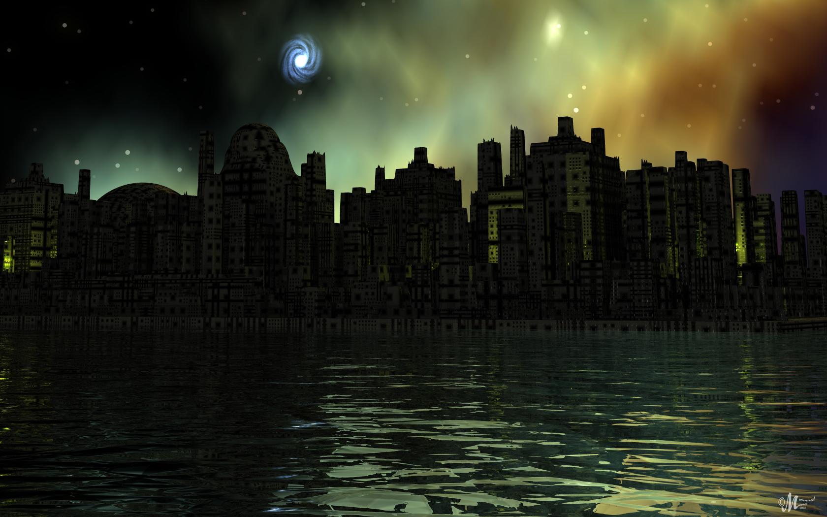 City at Twilight is a model from Sharecg by Steve, lighting from the Deep Space 2 and a galaxy from Space construction Kit
