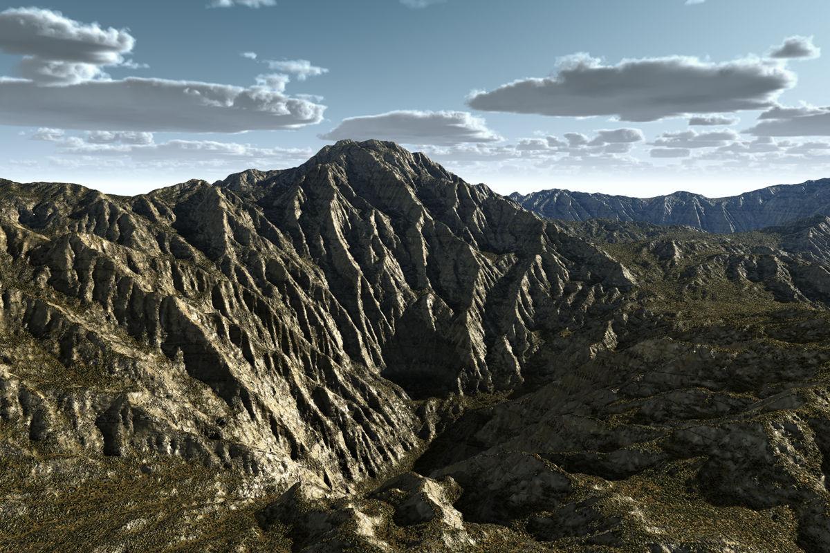 The terrain is from Grand Mountains with a material from High Resolution Terrains 4. Sky by a Cloud Sphere and the ambient light by a SkySC HDRI and the key light by the sun.