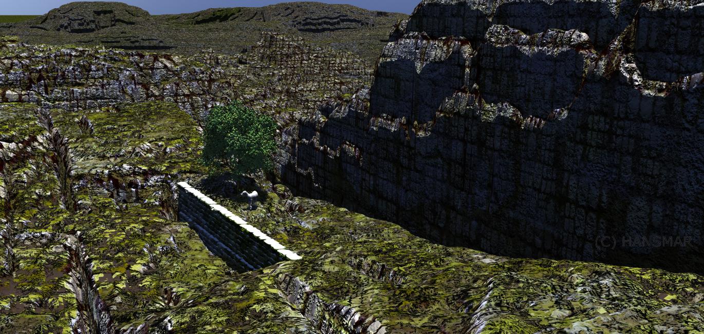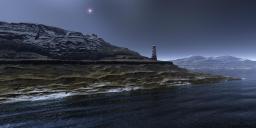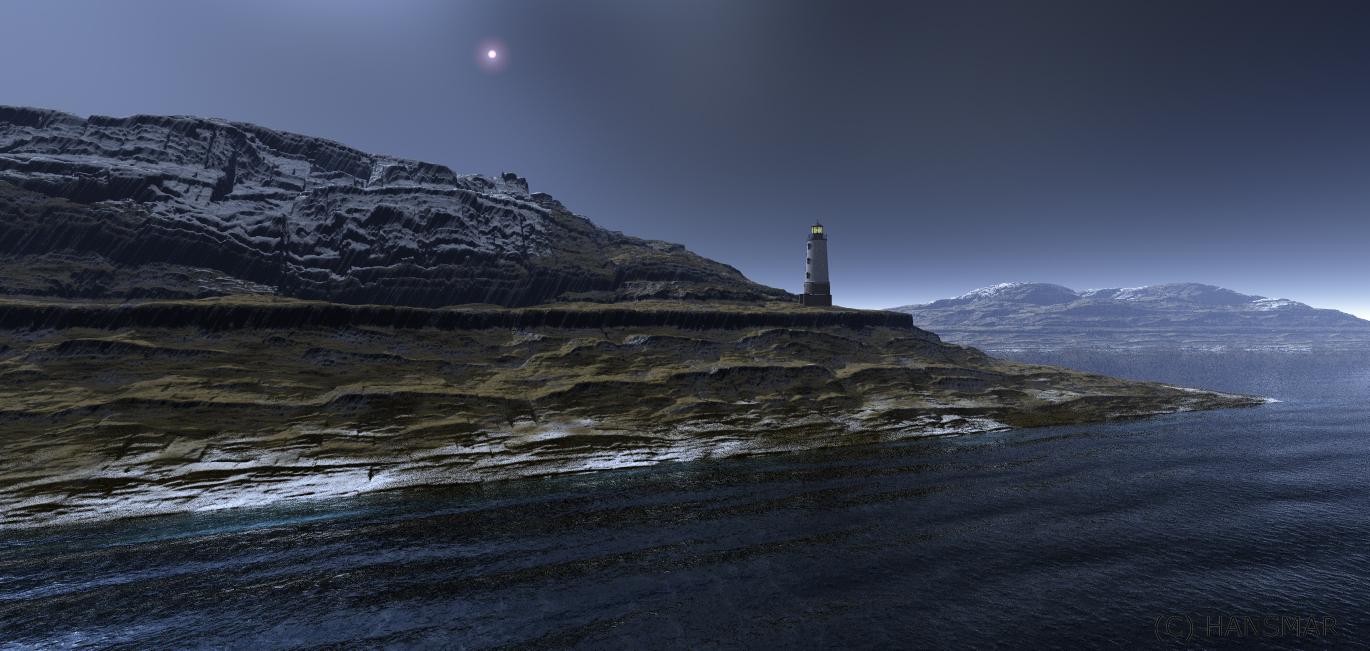 I made two renders with the 'Block' environment from the Hi-Res terrains 2. In the first one, I put the camera in a kind of canyon within the terrain, added a rock wall, a tree and a DAZ lamb. In the second one, the camera is at the outside and I added a lighthouse (with a light) as well as a red sun from the space render kit. The texture in the second one is not from the Hi-Res terrains. In both cases, the sky is by David B and Horo and a second iteration of the terrain is in the background.