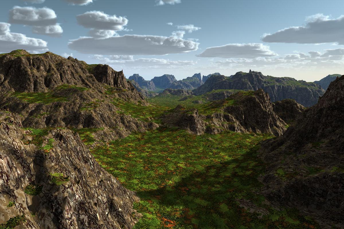 The terrain is from High Resolution Terrains 1 with an assembled and modified material from the same set, Grand Mountains and Terrain Stacking. Sky by the CloudSphere15, the ambient light by the SkySphere15 HDRI (unpublished) and the key light by the sun.