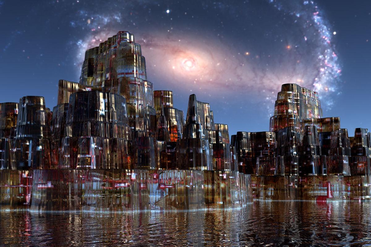 Two self made terrains with the Techno Glass material by David Brinnen, they stand on the ground plane with a self made water material. Sky and ambient light by an HDRI from Deep Space HDRI 2 and the key light by the sun. An outlandish city on a far away planet.