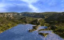 The terrain is from Gritstone Hills with a material combined from High Resolution Terrains 1 and 2, the water is the ground plane with a material from High Resolution Terrains 4. Sky and ambient light by an unpublished HDRI and the key light by the sun.