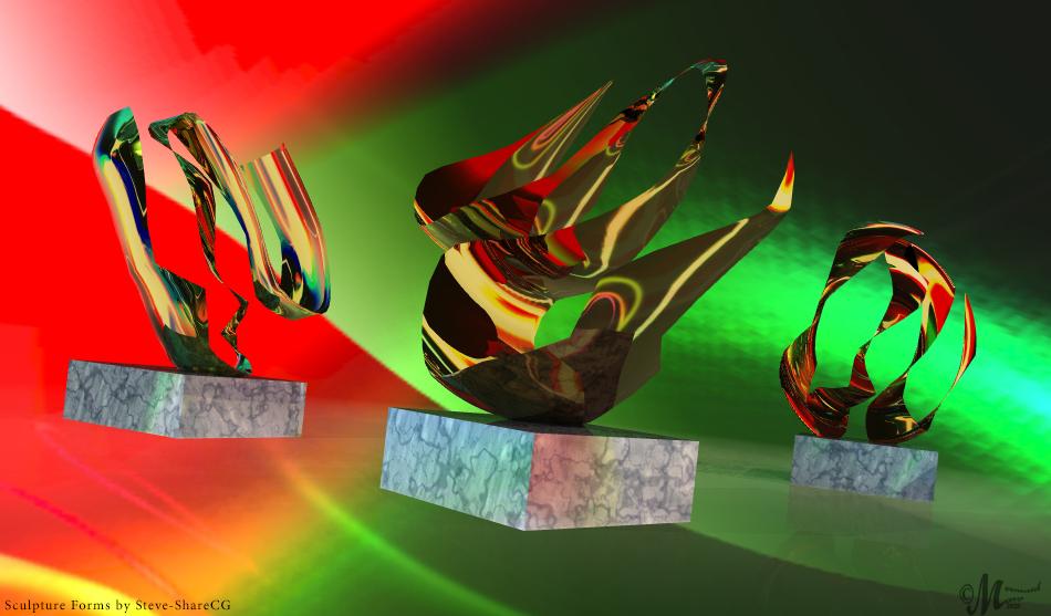 A quick renders using a file by Steve- Sculpture forms downloaded from ShareCG, lit by an Hdri from the Hyper Textures Base, on a fading disk.
