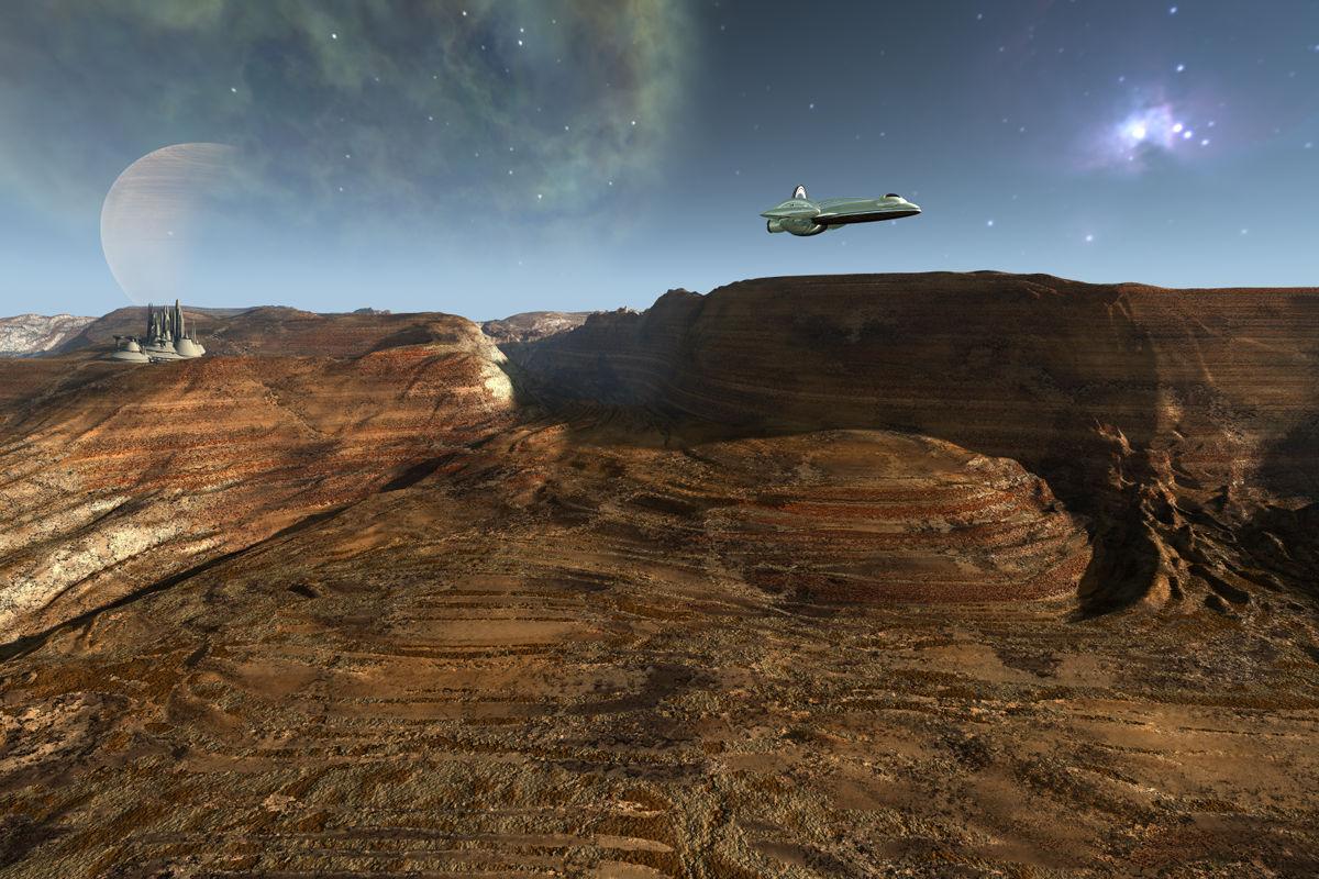 Double stacked self made terrain with materials from High Resolution Terrains 2 & 4. The building is the Martian Colony City by Herminio Nieves (2013), the aircraft the Patrol Spaceship1 by Angel Estevez (2006), the moon was self made. Sky, ambient light and the Orion Nebula M42 by an HDRI from the Deep Space HDRI 2 and the key light by the sun.