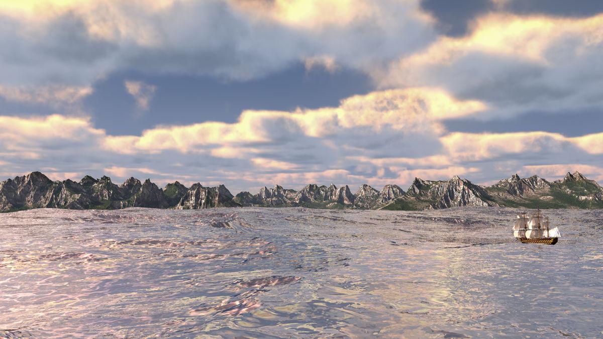 Four self made terrains, in front one for the water with a self made material, in the back three for the land with a material from High Resolution Terrains 1. The ship is the HMS Victory. Sky and clouds by the CloudSphere6 from the Sky Toolbox, the ambient light by the belonging HDRI and the key light by the sun.