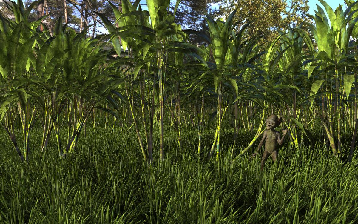 A plant (Bryce tree) from Vegetation and 15 instances. They stand on a grass-terrain by David Brinnen. The high grass in the foreground is a Bryce tree after an idea by SlepAlex. The waving hobgoblin is the Gremlin. Background and ambient light by an unpublished HDRI and the key light by the sun.