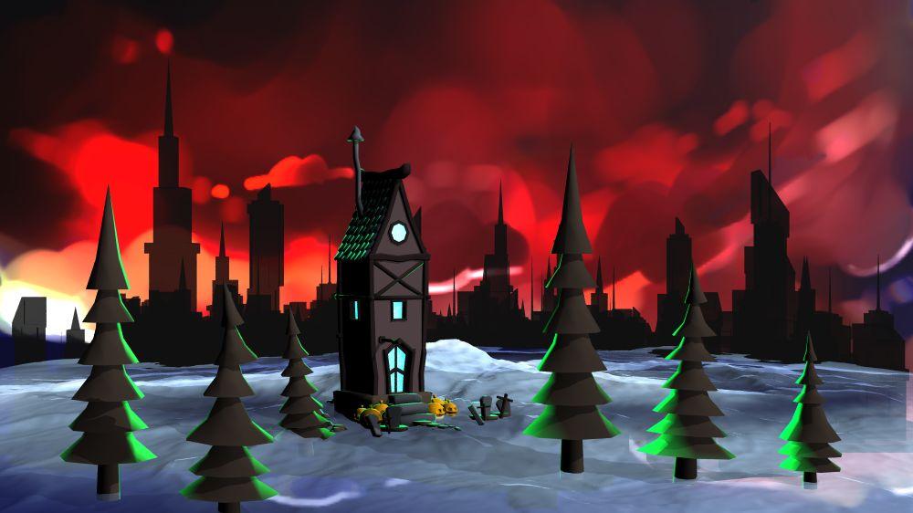 The house is from sketchfab by Karthik Nadu, separated the trees from the house and moved them around, background city from sharecg.