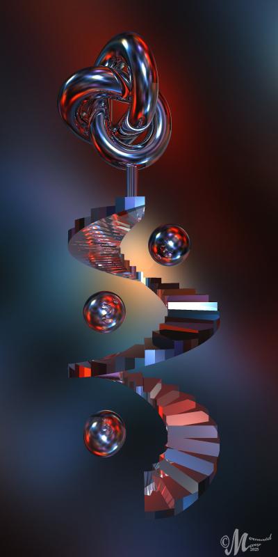 The object is pTurbine by richter (free at bryce5.com, 3ds Models) and below one turned on its head. The camera is within and rendered as 360 Panorama. Light by the Burns_SC HDRI (unpublished) from inside, no light from the outside. The HDRI was made from a render, also by richter, in 2009. Within an old and strange tower.