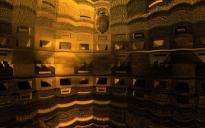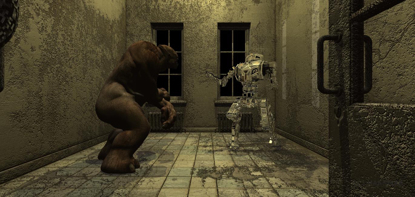 I used a room from DAZ 3D, but weirdly cannot find it anymore in my DAZ files and do not remember the name. I made two very different scenes. One is using the original textures and shows a confrontation between a robot and a troll, while the other one (with a different camera setting and position) has modified (Bryce) textures and shows a lady sitting in a chair. In the last one I again added a reflection, but this time using a mirror.
