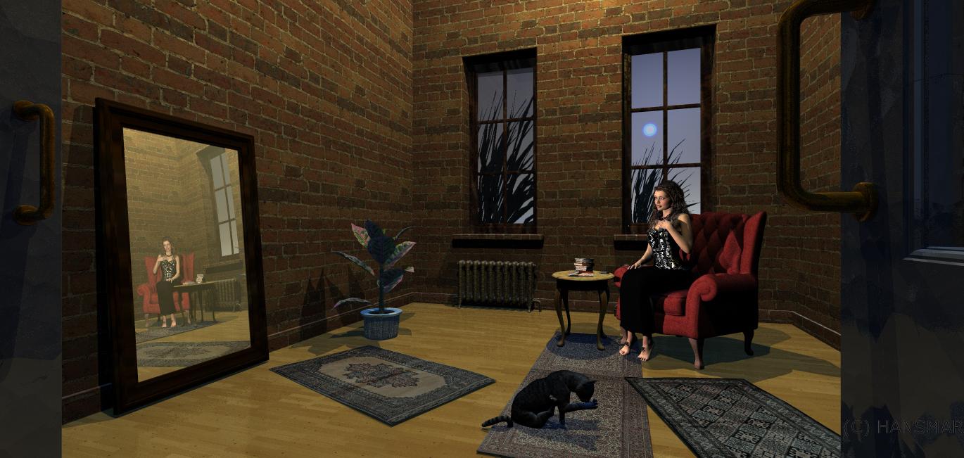 Two very nice indoor renders, Hansmar. The first is dramatic and could be in a prison cell. The second looks like a cosy room even though it is the same room. Very nice how the lady sits on a chair and there is probably a cup of tea on the table; the cat on the carpet is sweet and the mirror is well placed.
