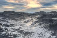 Double stacked terrain from High Resolution Terrains 1 with materials from the same set and a self made one. In front of the camera a warm-red filter from Lenses and Filters. Sky and ambient light by an unpublished HDRI and the key light by the sun. Ravines in a  mountainscape.