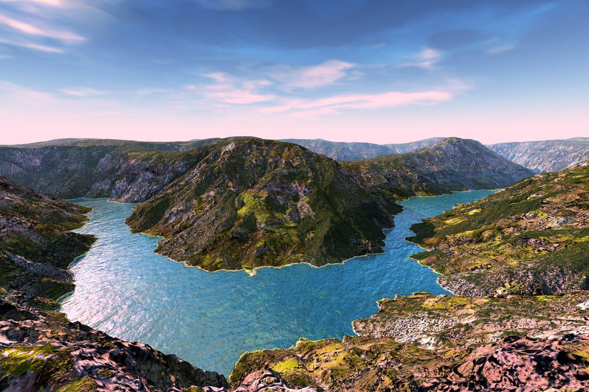 Double stacked terrain from High Resolution Terrains 1 with materials from the same set and High Resolution Terrains 2. The water is a 2D-Face with a self made material. Sky and ambient light by the ernie-clouds HDRI (free on my website: Raytracing > Resources > HDRI (Angular Map for Bryce 6 and 7)). The key light by the sun. A river meanders through a hilly landscape.
