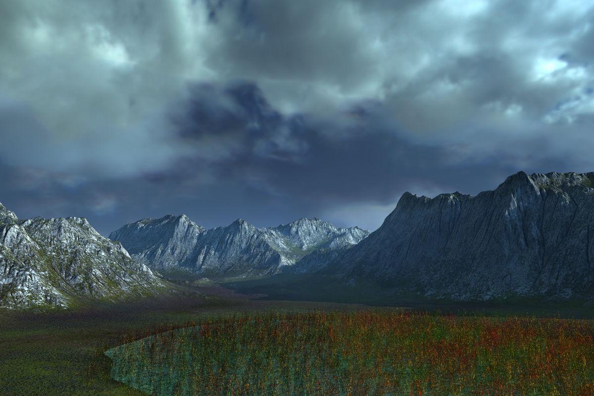 The terrain is from Terrain Stacking with a material from the same set. The grass is a self made terrain with a self made material as well, the water is the ground plane again with my own material. Sky and ambient light by an HDRI from High Resolution Terrains 4 and the key light by the sun. A valley in a mountainous region in the moonlight.