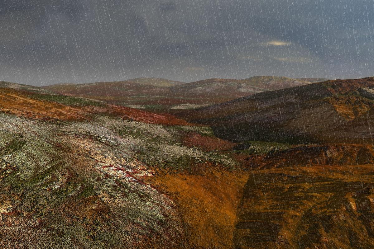 Terrain and material are from Gritstone Hills. The rain is from a rain-cube from Environments - Inclement Weather. Sky and ambient light by an HDRI from Terrain Stacking and the key light by the sun.