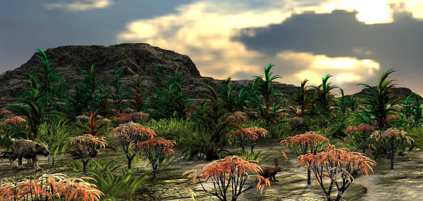 I made a scene with a landscape with a terrain (plateaux) from one of the sets with high resolution terrains (Horo and David B), a panther from DAZ and a static hare prop. The vegetation is from the Pro Vegetation (again by David and Horo) and three of them have been instanced multiple times. The sky is from the example two from the sunless HDRI set.