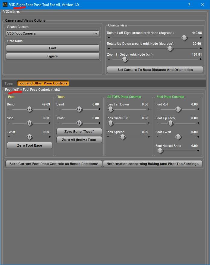 - you can zero indivdual fingers/toes (or zero all at once) even if you used Pose Controls, thanks to integrated baking utilities, automatical for given operations (zeroing triggers a bake) and if you prefer you can click a button to trigger the bake to transforms action on hand/foot (then the pose controls are zeroed but the pose is kept, allowing you to work more freely on further adjustments)