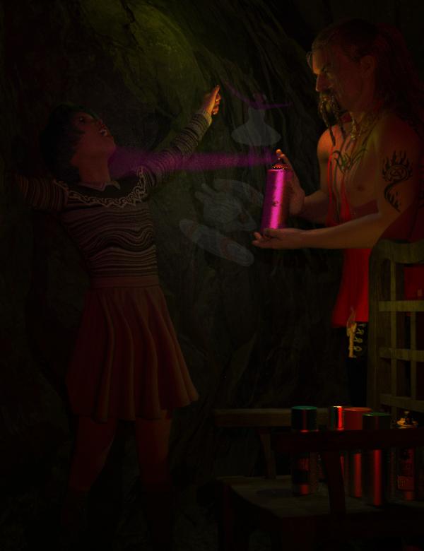 The caves at Altamira are rumored to have been painted by Louis Tinayre and commissioned by Prince Albert I of Monaco. Following in that tradition, Socquette Toomey’s cave paintings have been commissioned by Maria. She believes that space aliens visited earth over 10,000 years ago and is determined to produce evidence that it happened. If she can convince the world then she will have attained a certain immortality. “Paint! I want my immortality! Let me have it, Socquette Toomey!”