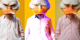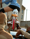 source_cartoon, rating_safe, score_9, score_8_up, score_7_up, score_6_up, Scared fluffy white male duck in brown plaid suit jacket (white shirt, red tie) standing on police car, orange duck legs.