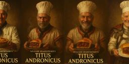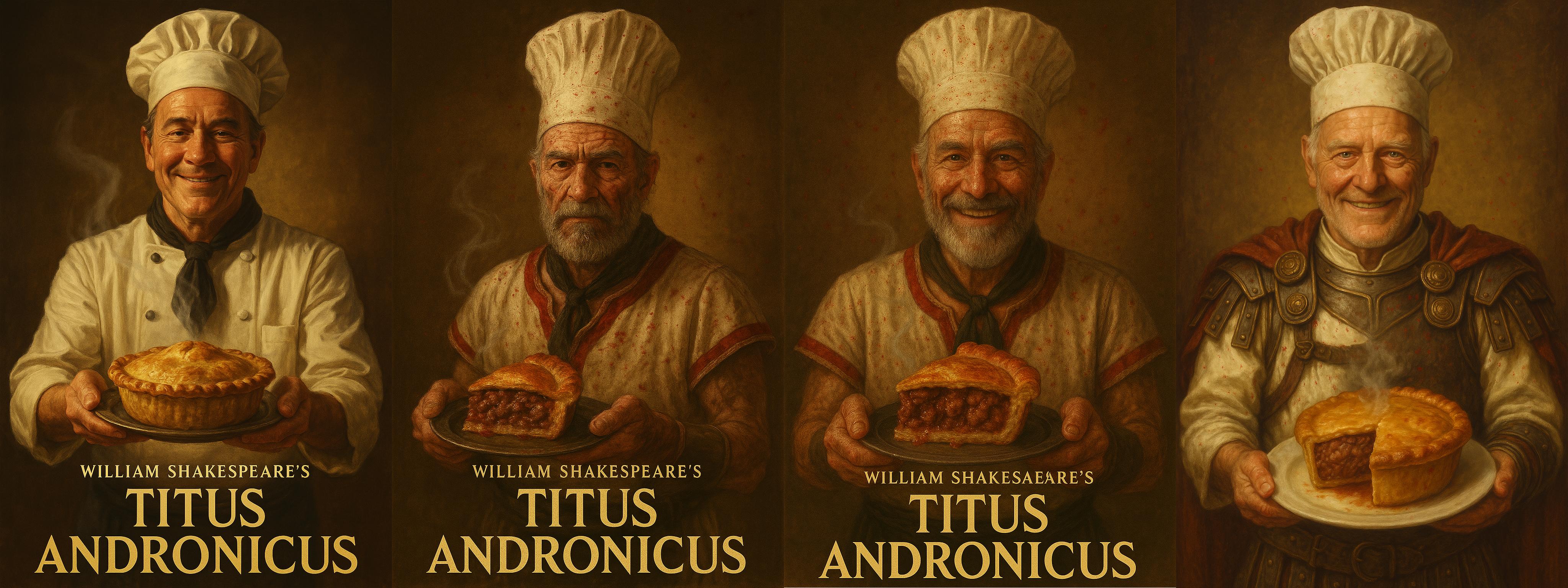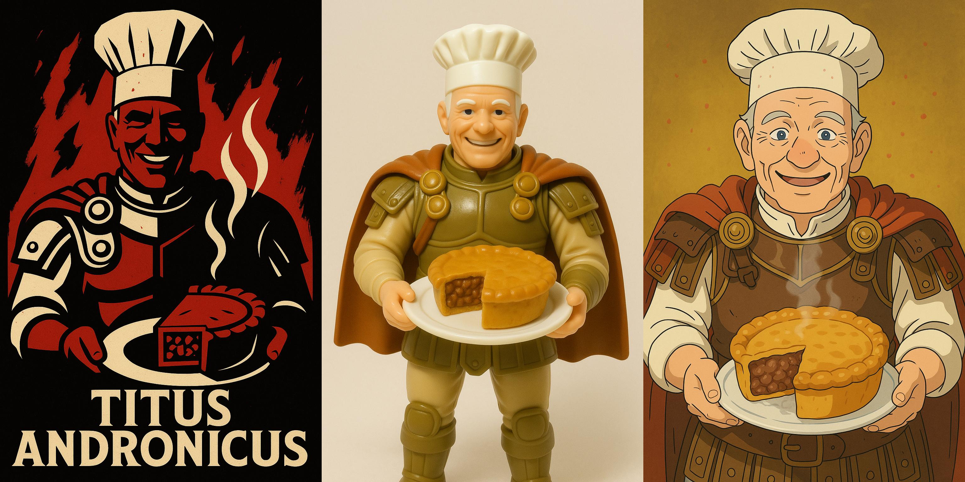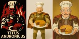 The first set of images tracks the evolution of the idea: from a full chef’s uniform to a grumpy, grizzled Roman in a shirt, then to a happier yet still battle-worn version. The final iteration—Titus in armor, holding his infamous pie—felt like the strongest realization of the concept.